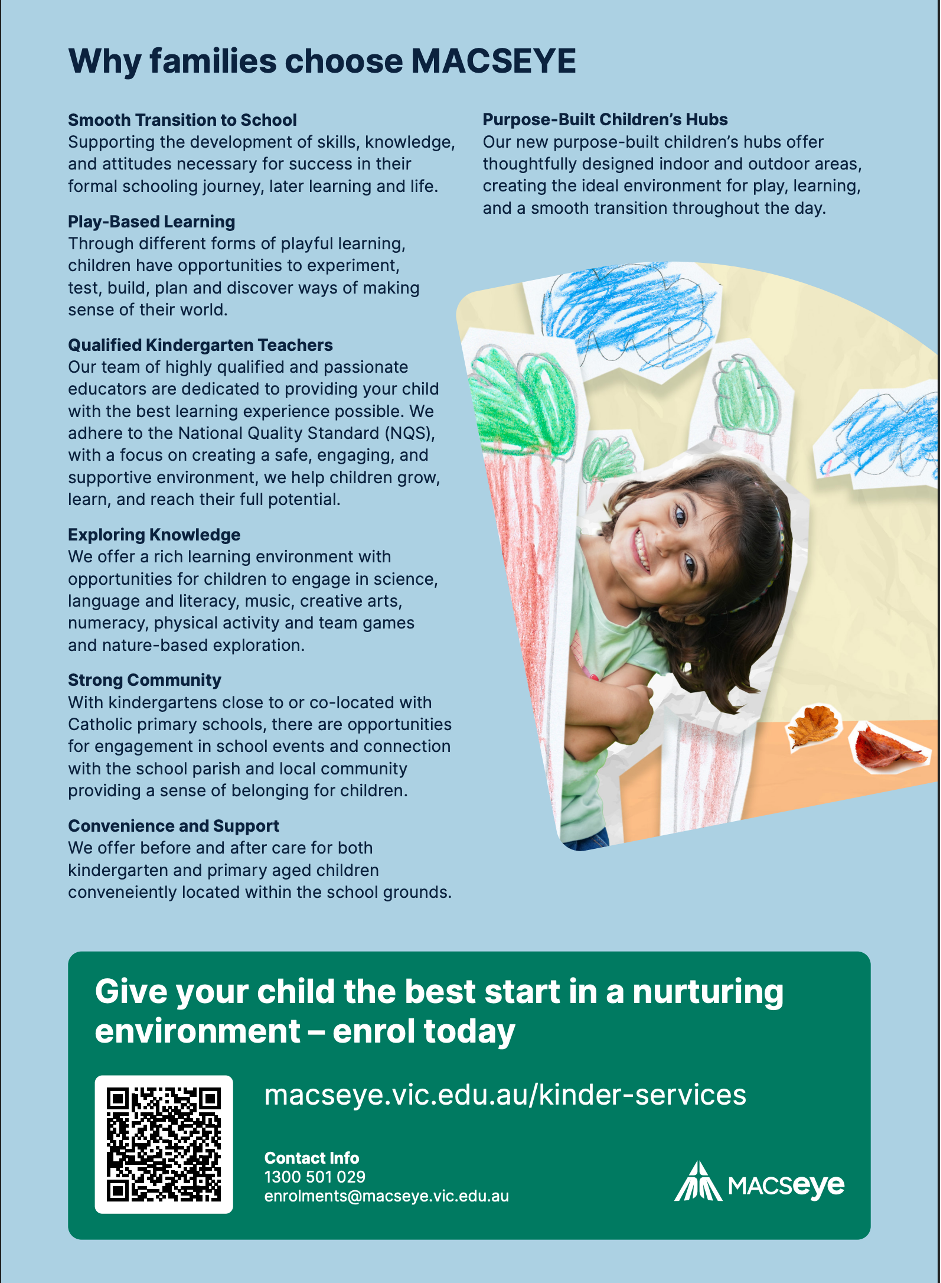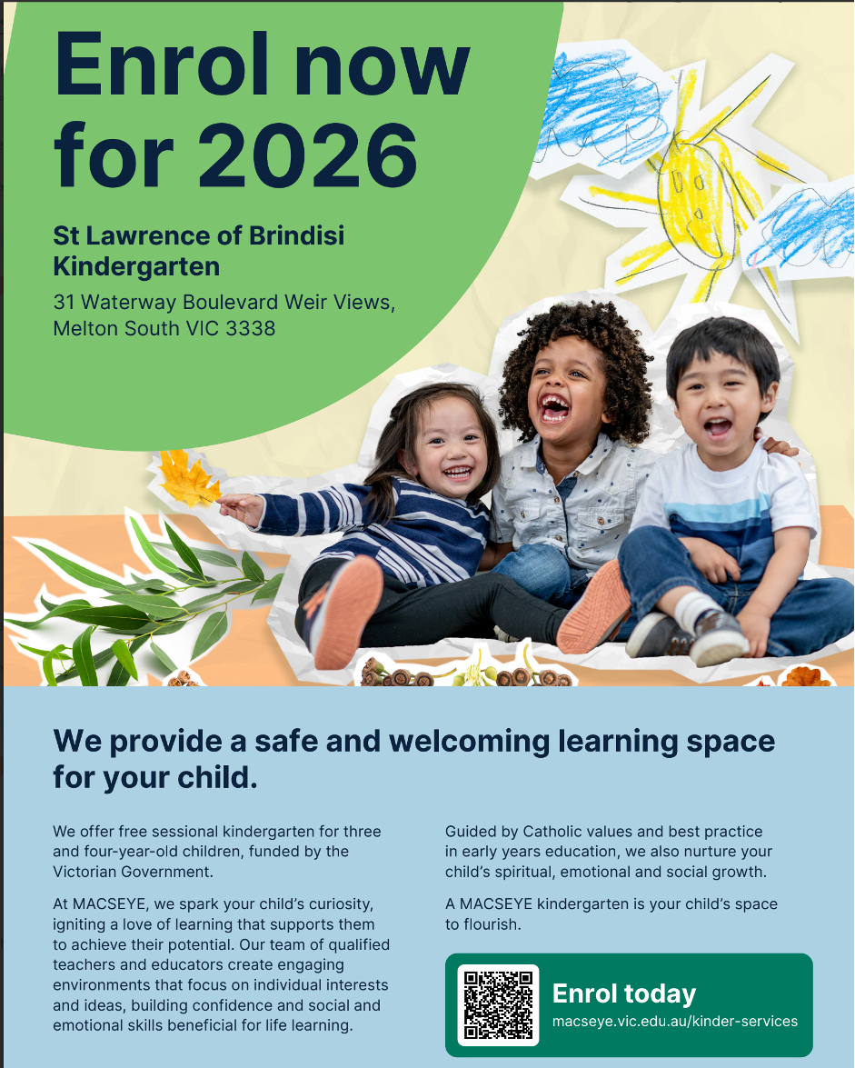 For more information or to submit an application visit https://macseye.vic.edu.au/kinder-services/st-lawrence-of-brindisi-kindergarten/