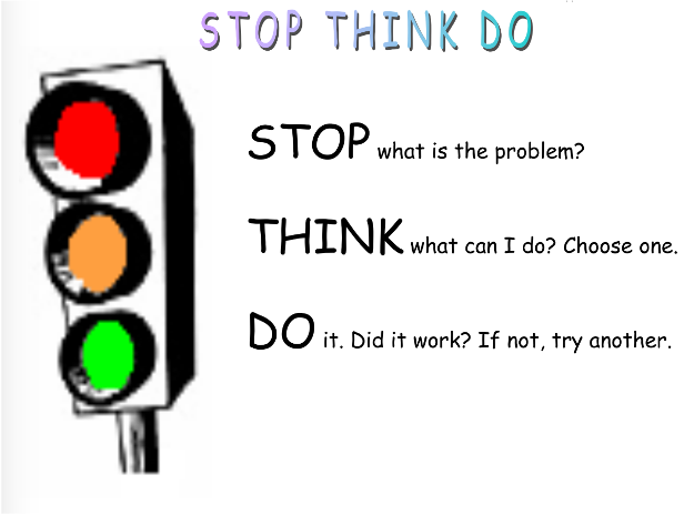 Across the school we encourage a problem solving strategy called STOP. THINK, DO.  This strategy is represented as a traffic light symbol.  Students will talk about ways to STOP, calm down, and then identify the problem they are faced with.